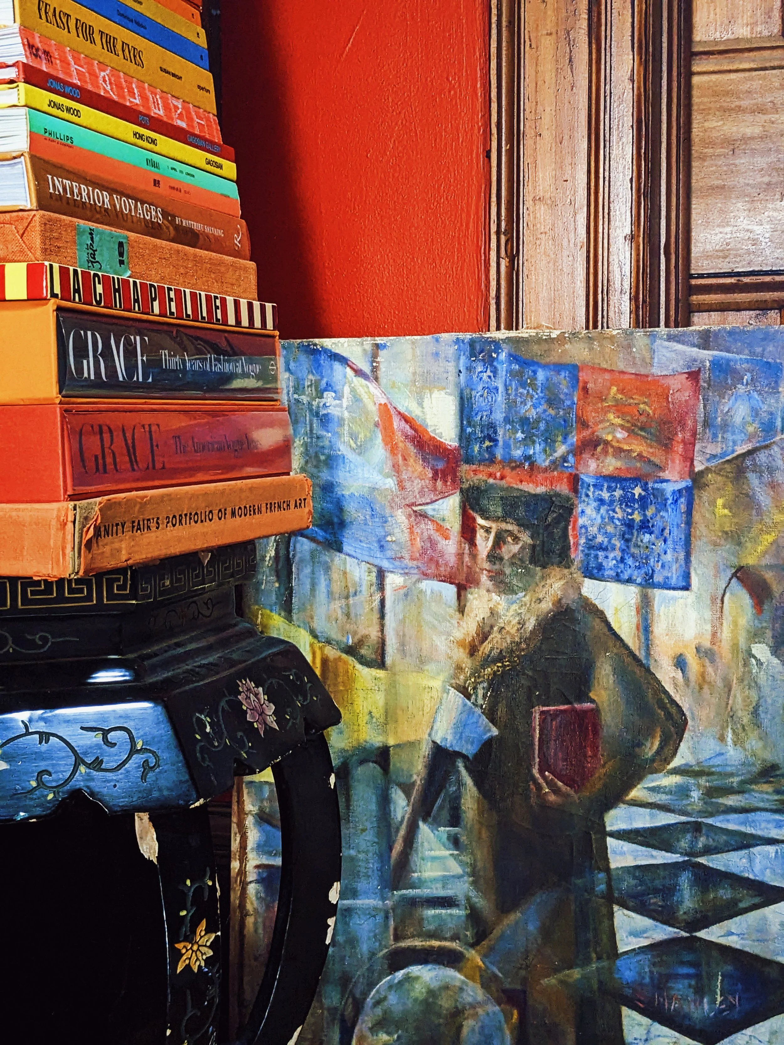 But sometimes you just know that you’re gonna get it . . . Once we were upstate, and I found a bunch of paintings, just digging through shops. I’m like, “We have to get these, they’re just all too good.” I was just grabbing them all, and I don’t know what I’m going to do with them. But then we started placing them around and thought, “This fits great.”
