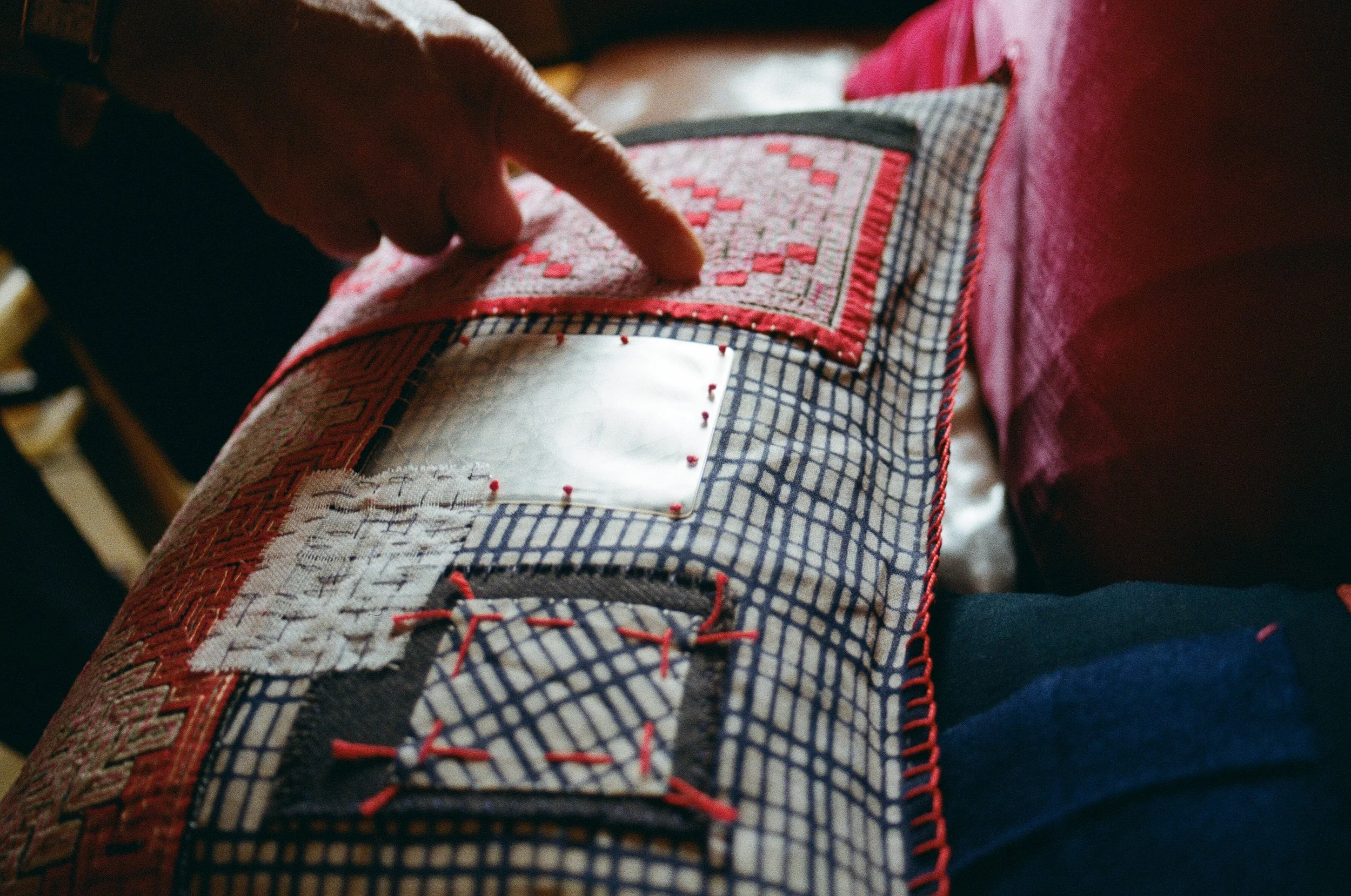 MB: I found all of these beautiful vintage pieces. I didn’t just want to take another culture’s work and stick it on a pillow and call it a day. The idea was a creation of using their artwork along with my artwork. I would create these separate little pieces and then incorporate the color and the texture in with what’s already been. I also like to mix in untraditional things. This is a PVC-plastic envelope, on the back it says “Yohji Yamamoto.” It was what he usually would put his tags in, and I just shredded some of this fabric and these threads from this fabric. I just try to incorporate my personal experience in, hopefully adding value to these pieces.